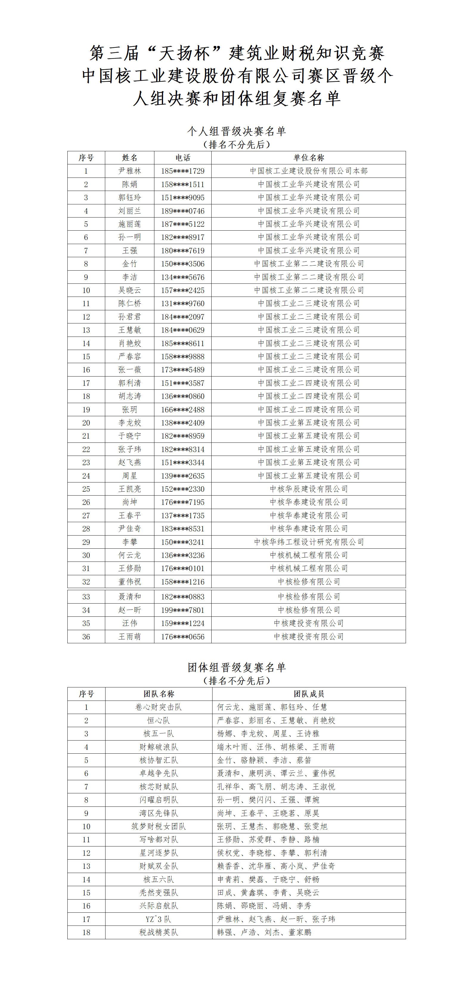 中国核工业建设股份有限公司赛区晋级个人组决赛和团体组复赛名单
