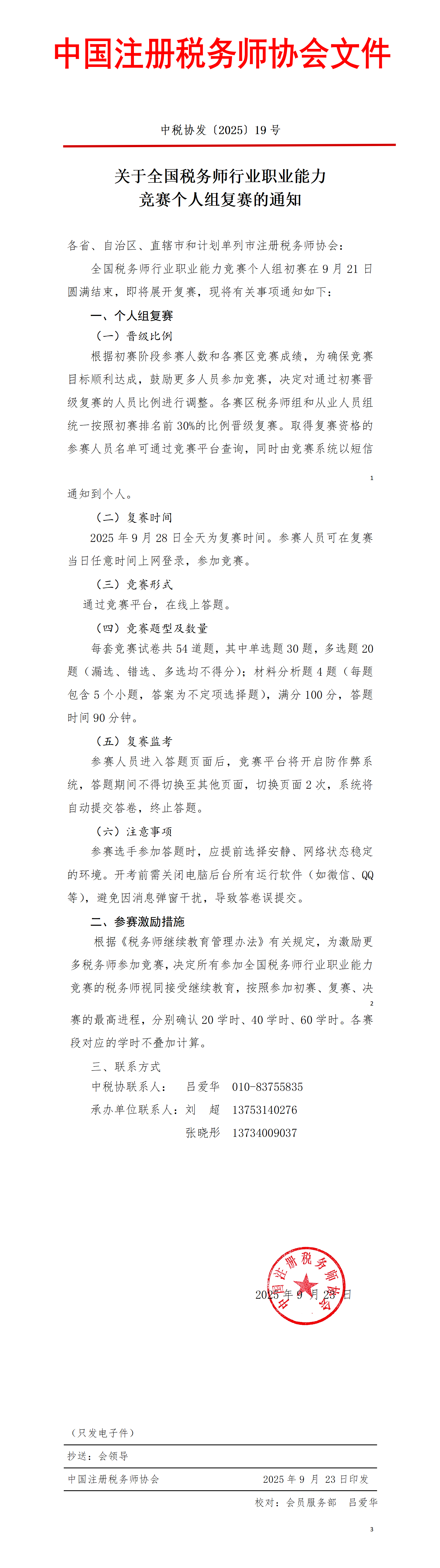 关于全国税务师行业职业能力竞赛个人组复赛的通知