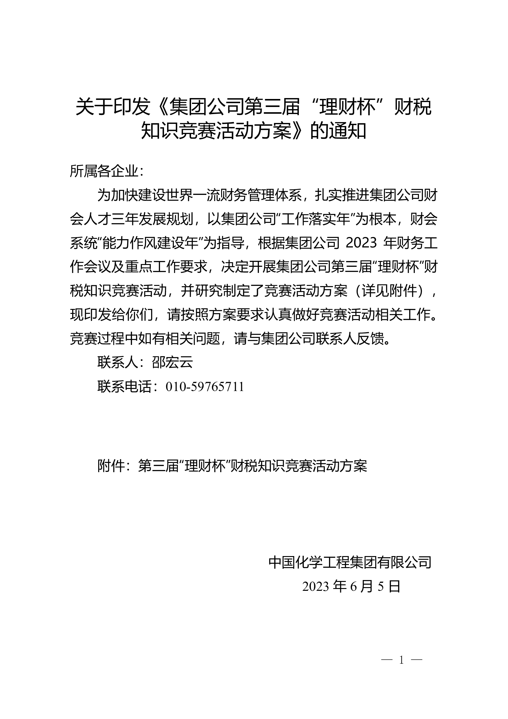 关于印发《集团公司第三届“理财杯”财税知识竞赛活动方案》的通知