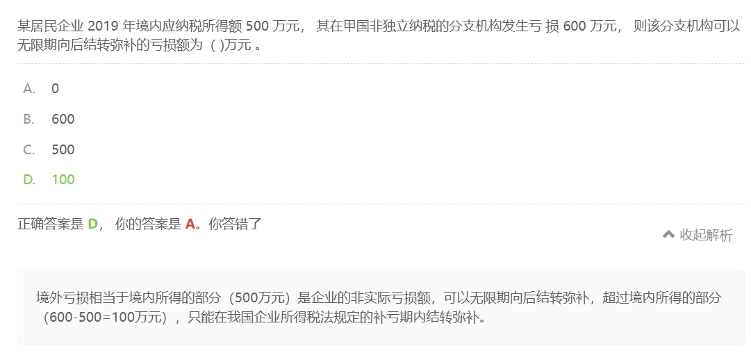 这道题的答案和解析相互矛盾,500万是企业的非实际亏损,可以无限期向后结转弥补,应该选择C答案(500)才对